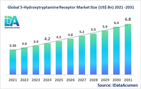 The 5-Hydroxytryptamine (5-HT) Receptor Market had an estimated market size worth US$ 4.2 billion in 2024, and it is predicted to reach a global market valuation of US$ 6.8 billion by 2031, growing at a CAGR of 7.2% from 2024 to 2031.