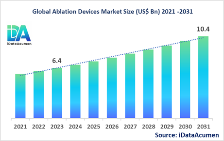 The Ablation Devices Market had an estimated market size worth US$ 6.4 billion in 2023, and it is predicted to reach a global market valuation of US$ 10.4 billion by 2031, growing at a CAGR of 6.3% from 2024 to 2031.