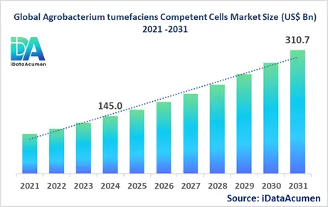 The Agrobacterium tumefaciens Competent Cells Market had an estimated market size worth US$ 145 million in 2024, and it is predicted to reach a global market valuation of US$ 310 million by 2031, growing at a CAGR of 11.5% from 2024 to 2031.