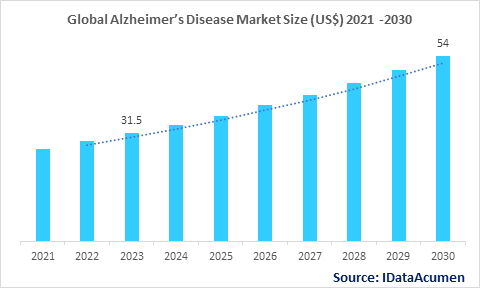 The Alzheimer's Disease Market is projected to expand to US $54 billion by 2030, compared to US $31.5 billion in 2023, exhibiting a compound annual growth rate (CAGR) of 8% throughout the forecast period. Alzheimer's disease is a progressive neurodegenerative disorder characterized by memory loss, impaired thinking, and changes in behavior. It is the most common cause of dementia. The rising prevalence of Alzheimer's disease due to aging populations is a key driver of market growth.