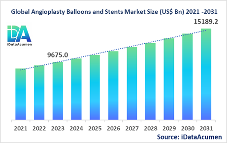 The Angioplasty Balloons and Stents Market had an estimated market size worth US$ 9,675 million in 2023, and it is predicted to reach a global market valuation of US$ 15,189.2 million by 2030, growing at a CAGR of 5.8% from 2024 to 2031.