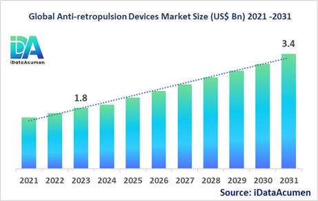 The Anti-retropulsion Devices Market had an estimated market size worth US$ 1.8 billion in 2023, and it is predicted to reach a global market valuation of US$ 3.4 billion by 2031, growing at a CAGR of 8.1% from 2024 to 2031.