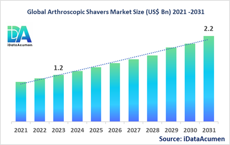 The Arthroscopic Shavers Market had an estimated market size worth US$ 1.2 billion in 2023, and it is predicted to reach a global market valuation of US$ 2.2 billion by 2031, growing at a CAGR of 7.8% from 2024 to 2031.