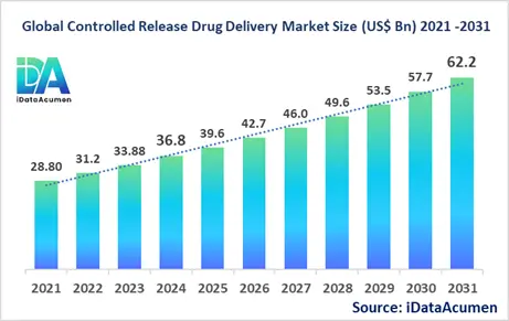 The Controlled Release Drug Delivery Market had an estimated market size worth US$ 36.75 billion in 2024, and it is predicted to reach a global market valuation of US$ 62.2 billion by 2031, growing at a CAGR of 7.8% from 2024 to 2031.