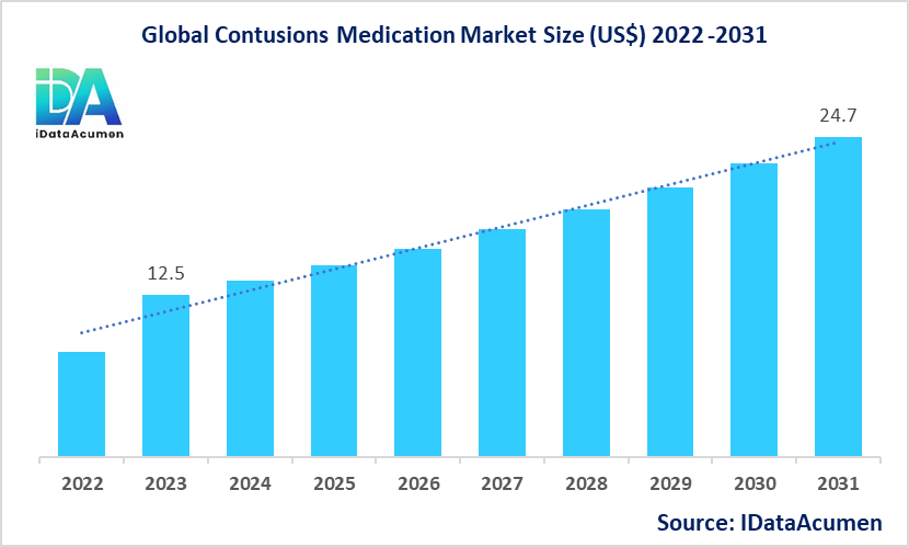 The Contusions Medication Market had an estimated market size worth USD 12.5 billion in 2023, and it is predicted to reach a global market valuation of USD 24.7 billion by 2031, growing at a CAGR of 7.8% from 2024 to 2031. Contusions medications are used to treat bruises caused by impact injuries leading to internal bleeding under the skin. These medications aid bruise healing and alleviate associated pain and inflammation. Key drivers include the rising prevalence of accidents/sports injuries causing contusions along with the growing aging population susceptible to bruising.