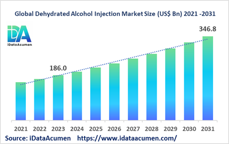 The Dehydrated Alcohol Injection Market had an estimated market size worth US$ 186 million in 2023, and it is predicted to reach a global market valuation of US$ 346.8 million by 2031, growing at a CAGR of 8.1% from 2024 to 2031. Dehydrated alcohol injection is used to treat methanol poisoning which happens when someone ingests or absorbs too much methanol. The injection works by inhibiting the metabolism of methanol into its toxic byproducts, helping restore acid-base balance and protect the nerves/vision from methanol toxicity.