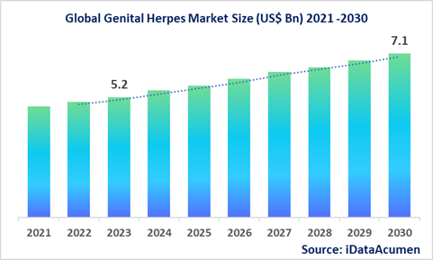 The Genital Herpes Market is projected to witness substantial growth, with an anticipated value of US$ 7.1 billion by the year 2030, marking a significant increase from its 2022 valuation of US$ 5.2 billion. This growth is expected to occur at a compound annual growth rate (CAGR) of 4.5% during the forecast period.