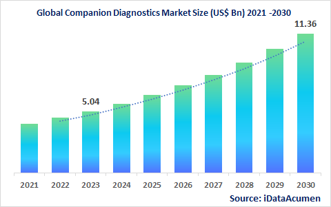 Global Companion Diagnostics Market accounted for US$ 4.0 Bn in 2021 and is expected to witness a CAGR of 12.3% over the forecast period (2022-2030) to reach US$ 11.3 Bn by 2030