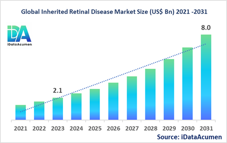 The Inherited Retinal Disease Market had an estimated market size worth US$ 2.1 billion in 2023, and it is predicted to reach a global market valuation of US$ 8.0 billion by 2031, growing at a CAGR of 18.2% from 2024 to 2031.