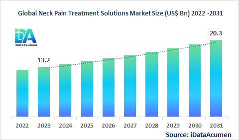The Neck Pain Treatment Solutions Market size is expected to reach USD 20.3 billion by 2031, from USD 13.2 billion in 2023, at a CAGR of 5.5% during the forecast period by 2024-2031. Neck pain treatment solutions include products like cervical collars, muscle relaxants, epidural injections, and surgical devices that help alleviate neck pain arising from musculoskeletal disorders, injuries, poor posture etc. The growing elderly population and lifestyle habits causing neck strain are key demand drivers.