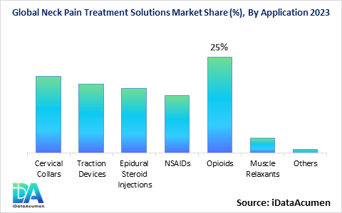 The Neck Pain Treatment Solutions Market is segmented by product, application, end-user, surgery type, and region. By product, the market is segmented into cervical collars, traction devices, epidural steroid injections, NSAIDs, opioids, muscle relaxants, and others. Opioids account for over 25% market share owing to their high analgesic properties. However, the focus is shifting towards safer non-opioid therapeutics. Medtronic launched the Intellis platform for spinal cord stimulation to precisely target neck pain.